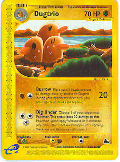 Type | Fighting | Pokemon serie | Skyridge | Stadie | Stage 1 | HP | 70 | Sjældenhed | Common | Tilbagetrækning | 1 | Modstand | L | Svaghed | G | Kortnummer | 52 | Evne | [CF] Burrow (20) Flip a coin. If heads, prevent all damage done by attacks to Dugtrio during your opponent's next turn. (any other effects of attacks still happen.) [CCC] Dig Under - Choose 1 of your opponent's Pokemon. This attack does 30 damage to that Pokemon. Don't apply Weakness or Resistance. (any other effects that would happen after applying Weakness and Resistance still happen.)