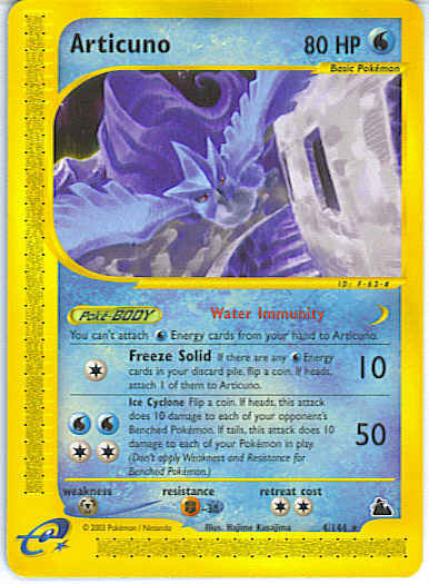 Type | Water | Pokemon serie | Skyridge | Stadie | Basic | HP | 80 | Sjældenhed | Rare | Tilbagetrækning | 2 | Modstand | F | Svaghed | M | Kortnummer | 4 | Evne | [C] Freeze Solid (10) If there are any W Energy cards in your discard pile, flip a coin. If heads, attach 1 of them to Articuno. [CCWW] Ice Cyclone (50) Flip a coin. If heads, this attack does 10 damage to each of your opponent's Benched Pokemon. If tails, this attack does 10 damage to each of your Pokemon in play. (Don't apply Weakness and Resistance for Benched Pokemon.)