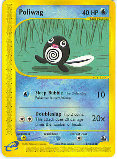 Type | Water | Pokemon serie | Skyridge | Stadie | Basic | HP | 40 | Sjældenhed | Common | Svaghed | L | Kortnummer | 87 | Evne | [W] Sleep Bubble (10) The Defending Pokemon is now Asleep. [CC] Doubleslap (20x) Flip 2 coins. This attack does 20 damage times the number of heads.