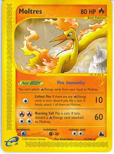 Type | Fire | Pokemon serie | Skyridge | Stadie | Basic | HP | 80 | Sjældenhed | Rare | Tilbagetrækning | 2 | Modstand | F | Svaghed | W | Kortnummer | 21 | Evne | [C] Collect Fire (10) If there are any R Energy cards in your discard pile, flip a coin. If heads, attach 1 of them to Moltres. [CCRR] Burning Tail (60) Flip a coin. If tails, discard a R Energy card attached to Moltres.