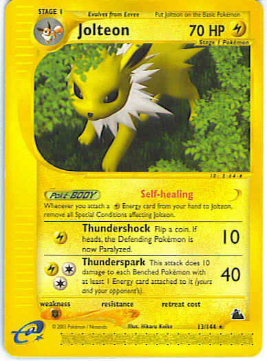 Type | Lightning | Pokemon serie | Skyridge | Stadie | Stage 1 | HP | 70 | Sjældenhed | Rare | Svaghed | F | Kortnummer | 13 | Evne | [L] Thundershock (10) Flip a coin. If heads, the Defending Pokemon is now Paralyzed. [CCL] Thunderspark (40) This attack does 10 damage to each Benched Pokemon with at least 1 Energy card attached to it (yours and your opponent's).