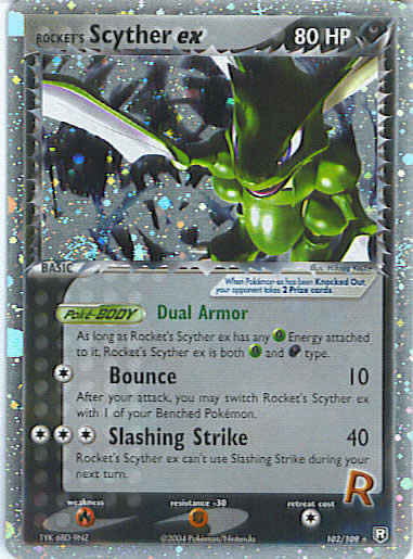 Type | Darkness | Pokemon serie | Team Rocket Returns | Stadie | Basic | HP | 80 | Sjældenhed | Ultra-Rare | Tilbagetrækning | 1 | Modstand | F | Svaghed | R | Kortnummer | 102 | Evne | [C] Bounce (10) After your attack, you may switch Rocket's Scyther ex with 1 of your Benched Pokemon. [CCC] Slashing Strike (40) Rocket's Scyther ex can't use Slashing Strike next turn. | Evne2 | [C] Bounce (10) After your attack, you may switch Rocket's Scyther ex with 1 of your Benched Pokemon. [CCC] Slashing Strike (40) Rocket's Scyther ex can't use Slashing Strike next turn. | Kunstner | Hikaru Koike |