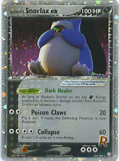 Type | Darkness | Pokemon serie | Team Rocket Returns | Stadie | Basic | HP | 100 | Sjældenhed | Ultra-Rare | Tilbagetrækning | 3 | Svaghed | F | Kortnummer | 104 | Evne | [CC] Poison Claws (20) Flip a coin. If heads, the Defending Pokemon is now Poisoned. [CCCC] Collapse (60) Rocket's Snorlax ex is now asleep. | Evne2 | [CC] Poison Claws (20) Flip a coin. If heads, the Defending Pokemon is now Poisoned. [CCCC] Collapse (60) Rocket's Snorlax ex is now asleep. | Kunstner | Mitsuhiro Arita |