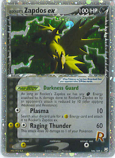 Type | Darkness | Pokemon serie | Team Rocket Returns | Stadie | Basic | HP | 100 | Sjældenhed | Ultra-Rare | Tilbagetrækning | 1 | Svaghed | L | Kortnummer | 106 | Evne | [C] Plasma (10) Search your discard pile for a Lightning Energy card and attach it to Rocket's Zapdos ex. [CLL] Raging Thunder (60) This attack does 30 damage to one of your Pokemon. | Evne2 | [C] Plasma (10) Search your discard pile for a Lightning Energy card and attach it to Rocket's Zapdos ex. [CLL] Raging Thunder (60) This attack does 30 damage to one of your Pokemon. | Kunstner | Ryo Ueda |
