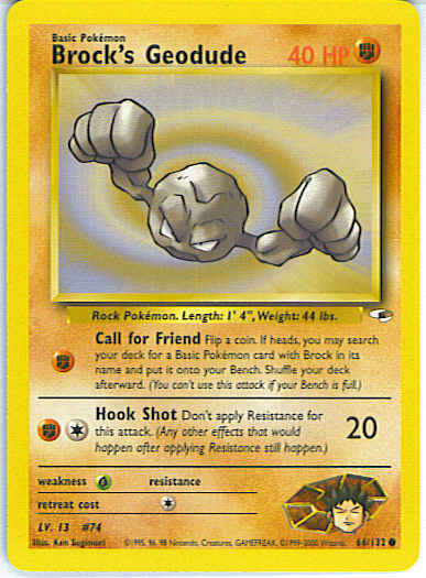 [F] Call for Friend - Flip a coin. If heads, you may search your deck for a Basic Pokemon card with Brock in its name and put it onto your Bench. Shuffle your deck afterward. (You can't use this attack if your Bench is full.)