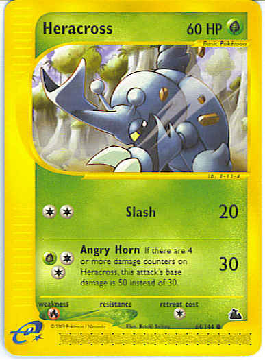 Type | Grass | Pokemon serie | Skyridge | Stadie | Basic | HP | 60 | Sjældenhed | Common | Tilbagetrækning | 1 | Svaghed | R | Kortnummer | 64 | Evne | [CC] Slash (20) [CCG] Angry Horn (30) If there are 4 or more damage counters on Heracross, this attack's base damage is 50 instead of 30.