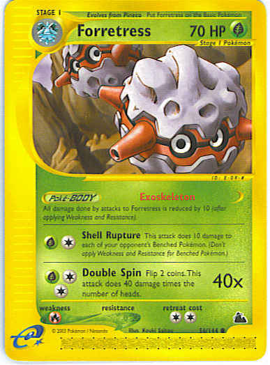 Type | Grass | Pokemon serie | Skyridge | Stadie | Stage 1 | HP | 70 | Sjældenhed | Common | Tilbagetrækning | 2 | Svaghed | R | Kortnummer | 56 | Evne | [CG] Shell Rupture - This attack does 10 damage to each of your opponent's Benched Pokemon. (Don't apply Weakness and Resistance for Benched Pokemon.) [CCG] Double Spin (40x) Flip 2 coins. This attack does 40 damage times the number of heads.