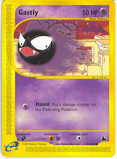 Type | Psychic | Pokemon serie | Skyridge | Stadie | Basic | HP | 50 | Sjældenhed | Common | Tilbagetrækning | 1 | Modstand | F | Svaghed | D | Kortnummer | 57 | Evne | [P] Haunt - Put a damage counter on the Defending Pokemon.