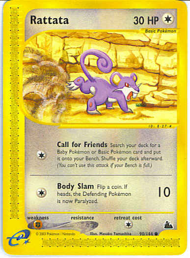 Type | Colorless | Pokemon serie | Skyridge | Stadie | Basic | HP | 30 | Sjældenhed | Common | Tilbagetrækning | 1 | Svaghed | F | Kortnummer | 90 | Evne | [C] Call for Friends - Search your deck for a Baby Pokemon or Basic Pokemon and put it onto your bench. Shuffle your deck afterward. (You can't use this attack it your bench is full.) [C] Body Slam (10) Flip a coin. If heads, the Defending Pokemon is now Paralyzed.