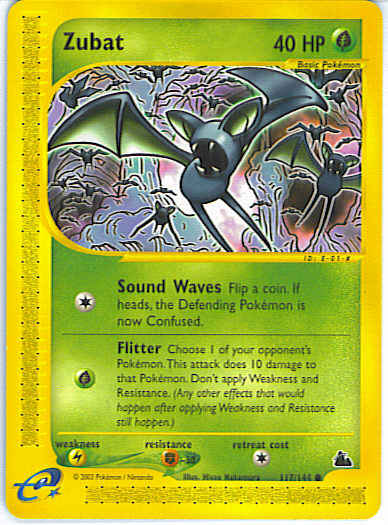 Type | Grass | Pokemon serie | Skyridge | Stadie | Basic | HP | 40 | Sjældenhed | Common | Tilbagetrækning | 1 | Modstand | F | Svaghed | L | Kortnummer | 117 | Evne | [C] Sound Waves - Flip a coin. If heads, the Defending Pokemon is now Confused. [G] Flitter - Choose 1 of your opponent's Pokemon. This attack does 10 damage to that Pokemon. Don't apply Weakness and Resistance. (Any other effects that would happen after applying Weakness and Resistance still happen.)