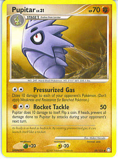 [CCF] Rocket Tackle (50) Pupitar does 10 damage to itself. Flip a coin. If heads, prevent all damage done to Pupitar by attacks during your opponent's next turn.