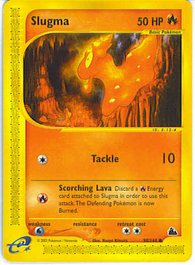 | Evne2 | [C] Tackle (10) [R] Scorching Lava - Discard a R Energy card attached to Slugma in order to use this attack. The Defending Pokemon is now Burned.