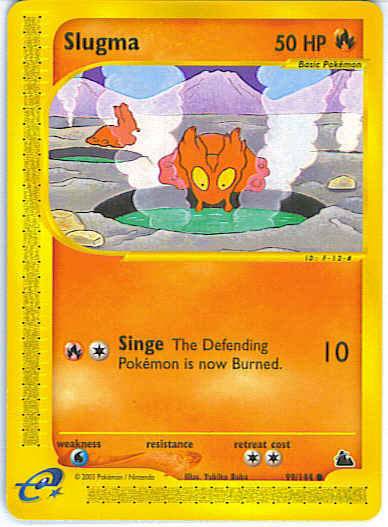 Type | Fire | Pokemon serie | Skyridge | Stadie | Basic | HP | 50 | Sjældenhed | Common | Tilbagetrækning | 2 | Svaghed | W | Kortnummer | 99 | Evne | [CR] Singe (10) The Defending Pokemon is now Burned.