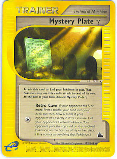 Type | Trainer | Pokemon serie | Skyridge | Stadie | Trainer (Technical Machine) | Sjældenhed | Uncommon | Kortnummer | 135 | Evne | [C] Retro Cave - If your opponent has 5 or more Prizes, shuffle your hand into your deck and then draw 6 cards. If your opponent has exactly 2 Prizes, choose 1 of your opponent's Evolved Pokemon. Your opponent puts the top card on that Evolved Pokemon on the bottom of his or her deck. (This counts as devolving that Pokemon.)