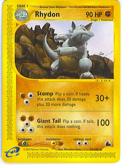 Type | Fighting | Pokemon serie | Skyridge | Stadie | Stage 1 | HP | 90 | Sjældenhed | Rare | Tilbagetrækning | 2 | Modstand | L | Svaghed | G | Kortnummer | 29 | Evne | [CCF] Stomp (30+) Flip a coin. If heads, this attack does 30 damage plus 20 more damage. [CCCFF] Giant Tail (100) Flip a coin. If tails, this attack does nothing