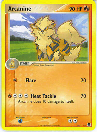 Type | Fire | Pokemon serie | Fire Red Leaf Green | Stadie | Stage 1 | HP | 90 | Sjældenhed | Rare | Tilbagetrækning | 2 | Svaghed | W | Kortnummer | 18 | Evne | [R] Flare (20) [CCCR] Heat Tackle (70) Arcanine does 10 damage to itself. | Evne2 | [R] Flare (20) [CCCR] Heat Tackle (70) Arcanine does 10 damage to itself. | Kunstner | Ken Sugimori |