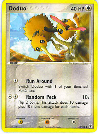 Type | Colorless | Pokemon serie | Fire Red Leaf Green | Stadie | Basic | HP | 40 | Sjældenhed | Common | Tilbagetrækning | 1 | Modstand | F | Svaghed | L | Kortnummer | 62 | Evne | [C] Run Around - Switch Doduo with 1 of your Benched Pokemon. [CC] Random Peck (10+) Flip 2 coins. This attack does 10 damage plus 10 more damage for each heads. | Evne2 | [C] Run Around - Switch Doduo with 1 of your Benched Pokemon. [CC] Random Peck (10+) Flip 2 coins. This attack does 10 damage plus 10 more damage for each heads. | Kunstner | Kagemaru Himeno |
