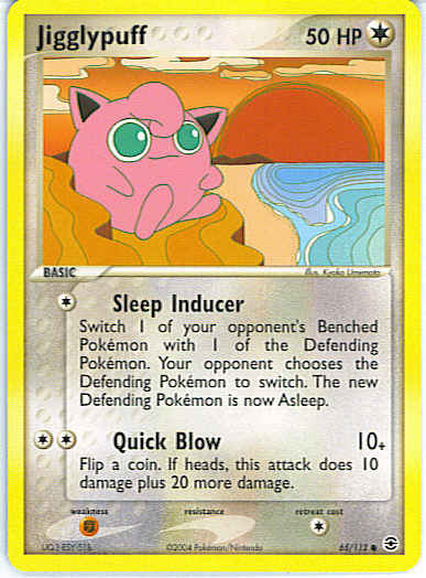 Type | Colorless | Pokemon serie | Fire Red Leaf Green | Stadie | Basic | HP | 50 | Sjældenhed | Common | Tilbagetrækning | 1 | Svaghed | F | Kortnummer | 65 | Evne | [C] Sleep Inducer - Switch 1 of your opponent's Benched Pokemon with 1 of the Defending Pokemon. Your opponent chooses the Defending Pokemon to switch. The new Defending Pokemon is now Asleep. [CC] Quick Blow (10+) Flip a coin. If heads, this attack does 10 damage plus 20 more damage. | Evne2 | [C] Sleep Inducer - Switch 1 of your opponent's Benched Pokemon with 1 of the Defending Pokemon. Your opponent chooses the Defending Pokemon to switch. The new Defending Pokemon is now Asleep. [CC] Quick Blow (10+) Flip a coin. If heads, this attack does 10 damage plus 20 more damage. | Kunstner | Kyoko Umemoto |