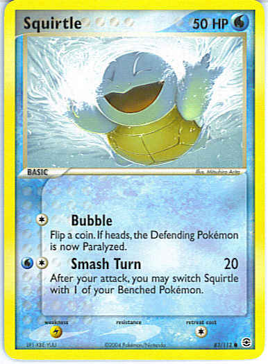 Type | Water | Pokemon serie | Fire Red Leaf Green | Stadie | Basic | HP | 50 | Sjældenhed | Common | Tilbagetrækning | 1 | Svaghed | L | Kortnummer | 83 | Evne | [C] Bubble - Flip a coin. If heads, the Defending Pokemon is now Paralyzed. [CW] Smash Turn (20) After your attack, you may switch Squirtle with 1 of your Benched Pokemon. | Evne2 | [C] Bubble - Flip a coin. If heads, the Defending Pokemon is now Paralyzed. [CW] Smash Turn (20) After your attack, you may switch Squirtle with 1 of your Benched Pokemon. | Kunstner | Mitsuhiro Arita |