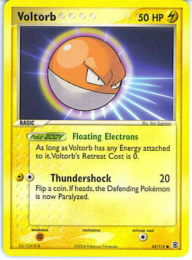 Type | Lightning | Pokemon serie | Fire Red Leaf Green | Stadie | Basic | HP | 50 | Sjældenhed | Common | Tilbagetrækning | 1 | Svaghed | F | Kortnummer | 85 | Evne | [CL] Thundershock (20) Flip a coin. If heads, the Defending Pokemon is now Paralyzed. | Evne2 | [CL] Thundershock (20) Flip a coin. If heads, the Defending Pokemon is now Paralyzed. | Kunstner | Ken Sugimori |