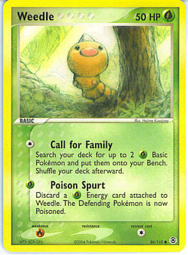 Type | Grass | Pokemon serie | Fire Red Leaf Green | Stadie | Basic | HP | 50 | Sjældenhed | Common | Tilbagetrækning | 1 | Svaghed | R | Kortnummer | 86 | Evne | [C] Call for Family - Search your deck for up to 2 G Basic Pokemon and put them onto your Bench. Shuffle your deck afterward. [G] Poison Spurt - Discard a G Energy card attached to Weedle. The Defending Pokemon is now Poisoned. | Evne2 | [C] Call for Family - Search your deck for up to 2 G Basic Pokemon and put them onto your Bench. Shuffle your deck afterward. [G] Poison Spurt - Discard a G Energy card attached to Weedle. The Defending Pokemon is now Poisoned. | Kunstner | Hajime Kusajima |