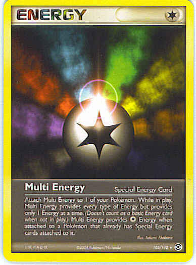 Evne Attach Multi Energy to 1 of your Pokemon. While in play, Multi Energy provides every type of Energy but provides only 1 energy at a time. (Doesn't count as a basic Energy card when not in play.) Multi Energy provides C Energy when attached to a Pokemon that already has Special Energy cards attached to it.