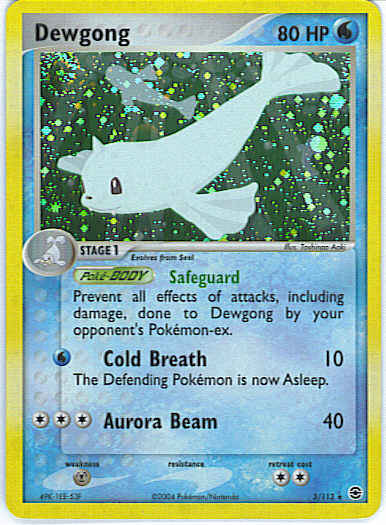 Type | Water | Pokemon serie | Fire Red Leaf Green | Stadie | Stage 1 | HP | 80 | Sjældenhed | Rare | Tilbagetrækning | 2 | Svaghed | M | Kortnummer | 3 | Evne | of attacks, including damage, done to Dewgong by your opponent's Pokemon-ex. (Poke-BODY)