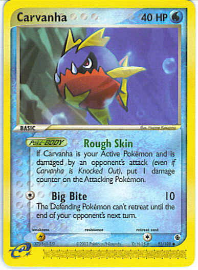 Type | Water | Pokemon serie | Ruby Sapphire | Stadie | Basic | HP | 40 | Sjældenhed | Common | Tilbagetrækning | 1 | Svaghed | L | Kortnummer | 51 | Evne | [C] Big Bite (10) The Defending Pokemon can't retreat until the end of your opponent's next turn.
