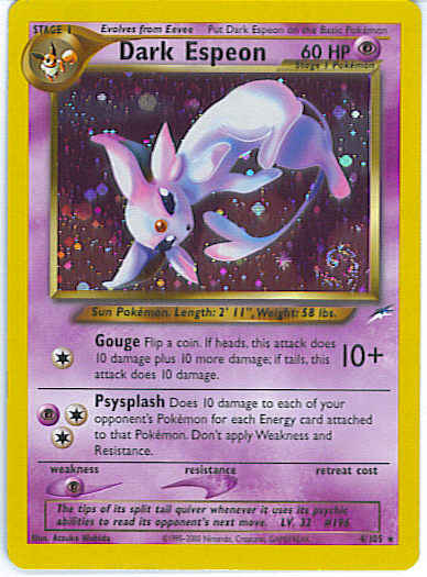 Type | Psychic | Pokemon serie | Neo Destiny | Stadie | Stage 1 | HP | 60 | Sjældenhed | Rare | Svaghed | P | Kortnummer | 4 | Evne |