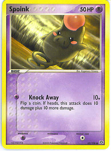 Type | Psychic | Pokemon serie | Emerald | Stadie | Basic | HP | 50 | Sjældenhed | Common | Tilbagetrækning | 1 | Svaghed | P | Kortnummer | 65 | Evne | [P] Knock Away (10+) Flip a coin. If heads, this attack does 10 damage plus 10 more damage. | Evne2 | [P] Knock Away (10+) Flip a coin. If heads, this attack does 10 damage plus 10 more damage. | Kunstner | Kagemaru Himeno |