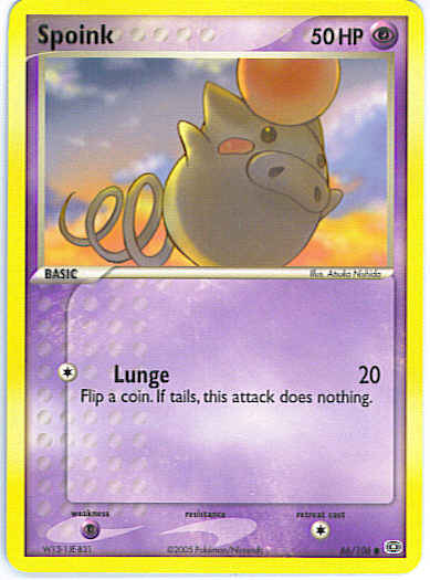 Type | Psychic | Pokemon serie | Emerald | Stadie | Basic | HP | 50 | Sjældenhed | Common | Tilbagetrækning | 1 | Svaghed | P | Kortnummer | 66 | Evne | [C] Lunge (20) Flip a coin. If tails, this attack does nothing. | Evne2 | [C] Lunge (20) Flip a coin. If tails, this attack does nothing. | Kunstner | Atsuko Nishida |
