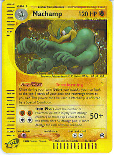 Type | Fighting | Pokemon serie | Expedition | Stadie | Stage 2 | HP | 120 | Sjældenhed | Rare | Tilbagetrækning | 2 | Svaghed | P | Kortnummer | 16 | Evne |