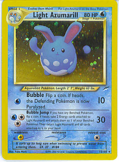 Type | Water | Pokemon serie | Neo Destiny | Stadie | Stage 1 | HP | 80 | Sjældenhed | Rare | Tilbagetrækning | 1 | Svaghed | L | Kortnummer | 13 | Evne |