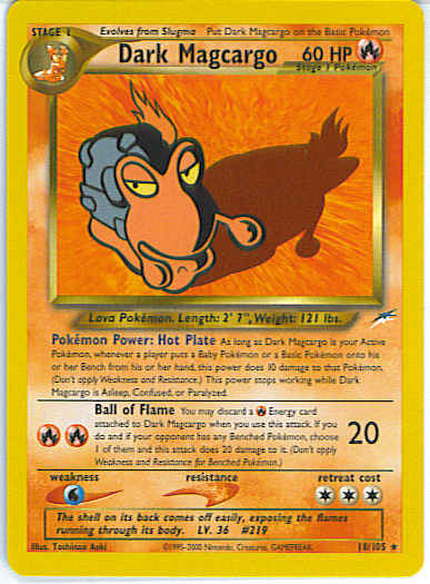 [RR] Ball of Flame (20) You may discard a Fire Energy card attached to Dark Magcargo when you use this attack. If you do and if your opponent has any Benched Pokemon, choose 1 of them and this attack does 20 damage to it. (Don't apply Weakness and Resistance for Benched Pokemon.)