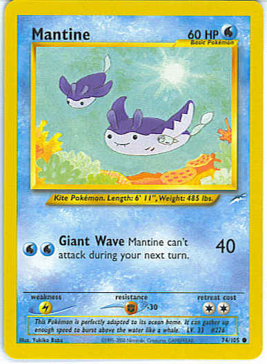 Type | Water | Pokemon serie | Neo Destiny | Stadie | Basic | HP | 60 | Sjældenhed | Common | Tilbagetrækning | 2 | Modstand | F | Svaghed | L | Kortnummer | 74 | Evne |