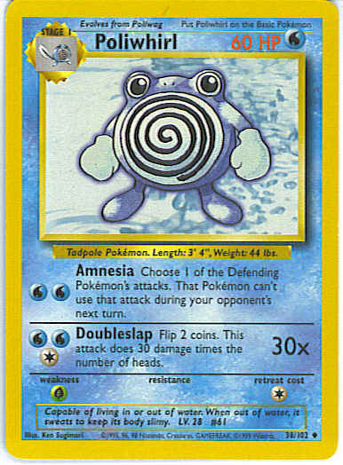 Type | Water | Pokemon serie | Base | Stadie | Stage 1 | HP | 60 | Sjældenhed | Uncommon | Tilbagetrækning | 1 | Svaghed | G | Kortnummer | 38 | Evne |