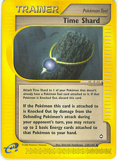 If the damage from your opponent's attack Knocks Out the Pokemon Time Shard is attached to during his or her turn, you may return up to 2 basic Energy cards attached to it to your hand. Then, discard Time Shard.