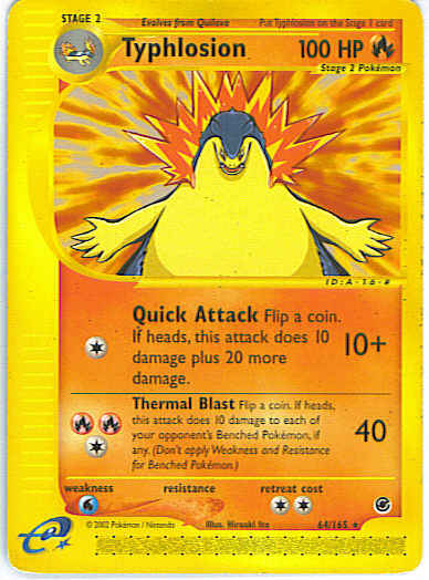 Type | Fire | Pokemon serie | Expedition | Stadie | Stage 2 | HP | 100 | Sjældenhed | Rare | Tilbagetrækning | 2 | Svaghed | W | Kortnummer | 64 | Evne |