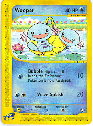 Type | Water | Pokemon serie | Aquapolis | Stadie | Basic | HP | 40 | Sjældenhed | Common | Tilbagetrækning | 1 | Svaghed | L | Kortnummer | 117 | Evne | [W] Bubble (10) Flip a coin. If heads, the Defending Pokemon is now Paralyzed. [CW] Wave Splash (20)