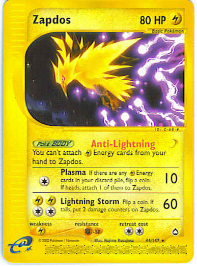 Type | Lightning | Pokemon serie | Aquapolis | Stadie | Basic | HP | 80 | Sjældenhed | Rare | Tilbagetrækning | 2 | Modstand | F | Svaghed | L | Kortnummer | 44 | Evne | [C] Plasma (10) If there are any L Energy cards in your discard pile, flip a coin. If heads attach 1 of those Energy cards to Zapdos. [CCLL] Lightning Storm (60) Flip a coin. If tails, put 2 damage counters on Zapdos.
