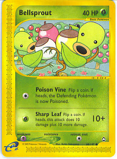 Type | Grass | Pokemon serie | Aquapolis | Stadie | Basic | HP | 40 | Sjældenhed | Common | Tilbagetrækning | 1 | Svaghed | P | Kortnummer | 68 | Evne | [C] Poison Vine - Flip a coin. If heads, the Defending Pokemon is now Poisoned. [G] Sharp Leaf (10+) Flip a coin. If heads, this attack does 10 damage plus 10 more damage.