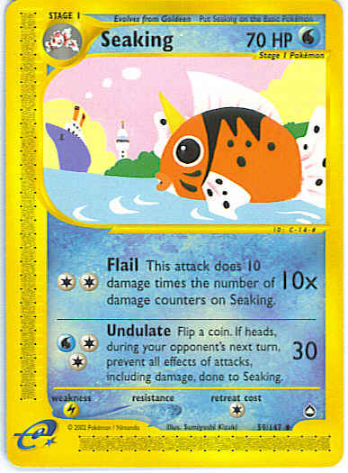 Type | Water | Pokemon serie | Aquapolis | Stadie | Stage 1 | HP | 70 | Sjældenhed | Uncommon | Tilbagetrækning | 1 | Svaghed | L | Kortnummer | 59 | Evne | [CC] Flail (10x) Does 10 damage times the number of damage counters on Seaking. [CCW] Undulate (30) Flip a coin. If heads, during your opponent's next turn, prevent all effects of attacks, including damage, done to Seaking.