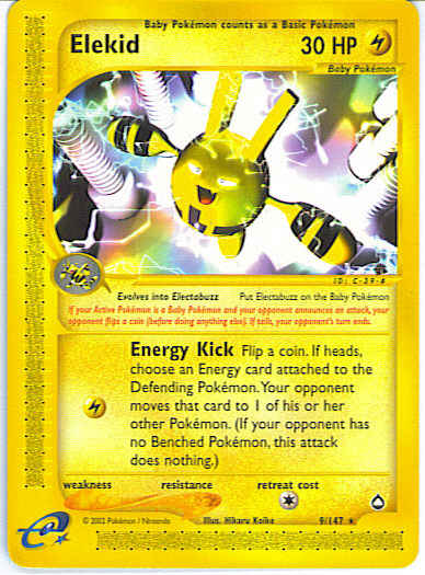 Type | Lightning | Pokemon serie | Aquapolis | Stadie | Baby | HP | 30 | Sjældenhed | Rare | Tilbagetrækning | 1 | Kortnummer | 9 | Evne | [L] Energy Kick - If your opponent has any Benched Pokemon, flip a coin. If heads, he or she chooses 1 of his or her Benched Pokemon and 1 Energy card attached to the Defending Pokemon, if any. Attach that Energy card to that Pokemon.