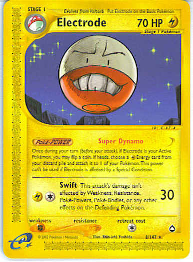 Type | Lightning | Pokemon serie | Aquapolis | Stadie | Stage 1 | HP | 70 | Sjældenhed | Rare | Tilbagetrækning | 1 | Svaghed | F | Kortnummer | 8 | Evne | [CL] Swift (30) This attack's damage isn't affected by Weakness, Resistance, Poke-Powers, Poke-Bodies, or any other effects on the Defending Pokemon.