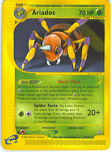 Type | Grass | Pokemon serie | Aquapolis | Stadie | Stage 1 | HP | 70 | Sjældenhed | Rare | Svaghed | R | Kortnummer | 3 | Evne | [CG] Spider Force (20+) Flip a coin. If heads, this attack does 20 damage plus 10 more damage. If tails, the Defending Pokemon is now Paralyzed.