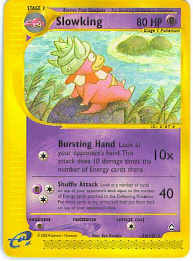 Evne | [C] Bursting Hand (10x) Look at your opponent's hand. This attack does 10 damage times the number of Energy cards in your opponent's hand. [CCP] Shuffle Attack (40) Look at a number of cards from the top of your opponent's deck equal to the number of Energy cards attached to the Defending Pokemon and rearrange them as you like.