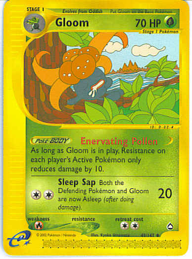 Type | Grass | Pokemon serie | Aquapolis | Stadie | Stage 1 | HP | 70 | Sjældenhed | Uncommon | Tilbagetrækning | 2 | Svaghed | R | Kortnummer | 49 | Evne | [CC] Sleep Sap (20) Both Gloom and the Defending Pokemon are now Asleep.
