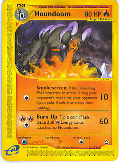 Type | Fire | Pokemon serie | Aquapolis | Stadie | Stage 1 | HP | 80 | Sjældenhed | Rare | Tilbagetrækning | 1 | Svaghed | W | Kortnummer | 14 | Evne | [C] Smokescreen (10) If the defending Pokemon tries to attack during your opponent's next turn, your opponent flips a coin. If tails, that attack does nothing. [CRR] Burn Up (60) Flip a coin. If tails, discard all R Energy cards attached to Houndoom.