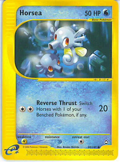 Type | Water | Pokemon serie | Aquapolis | Stadie | Basic | HP | 50 | Sjældenhed | Common | Tilbagetrækning | 1 | Svaghed | L | Kortnummer | 85 | Evne | [CC] Reverse Thrust (20) If you have any Benched Pokemon, choose 1 of them and switch it with Horsea.