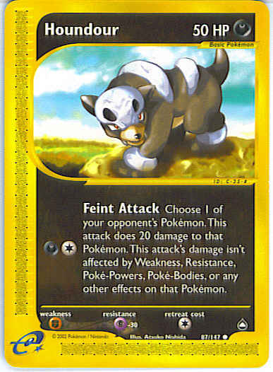 Type | Darkness | Pokemon serie | Aquapolis | Stadie | Basic | HP | 50 | Sjældenhed | Common | Tilbagetrækning | 1 | Modstand | P | Svaghed | F | Kortnummer | 87 | Evne | [CD] Feint Attack - Choose 1 of your opponent's Pokemon. This attack does 20 damage to that Pokemon. This attack's damage isn't affected by Weakness, Resistance, Poke-Powers, Poke-Bodies, or any other effects on the Defending Pokemon.